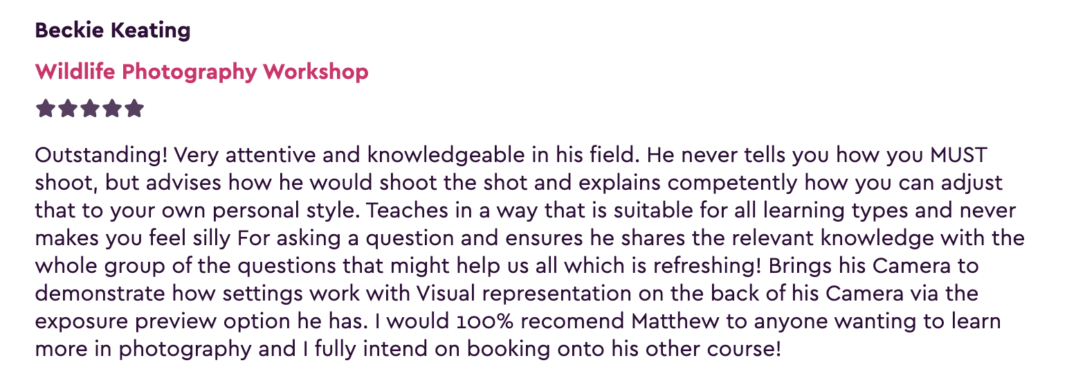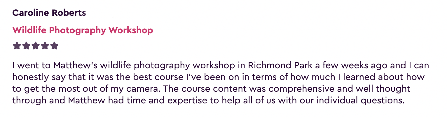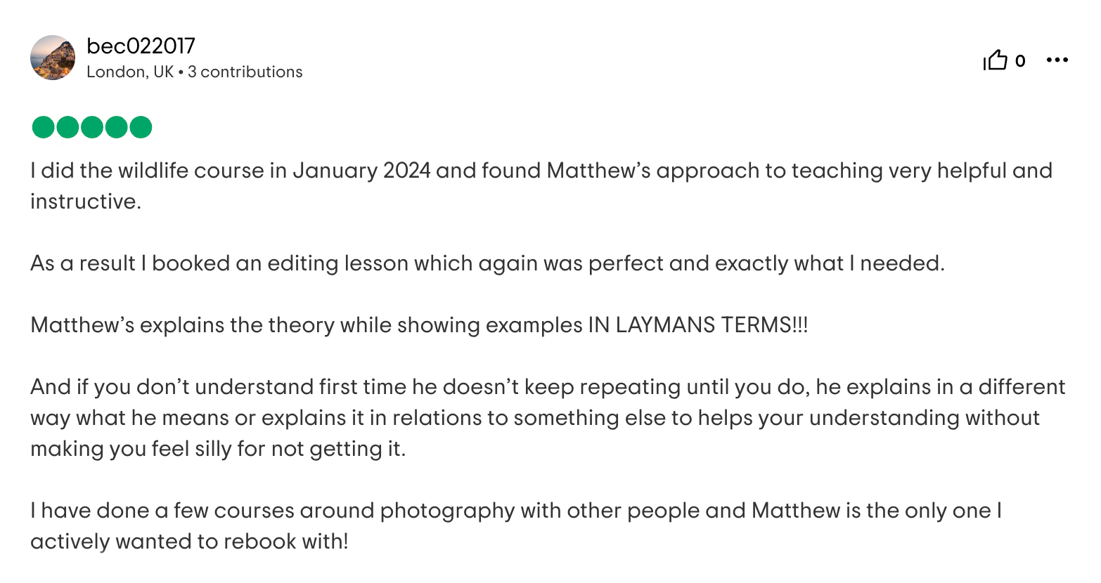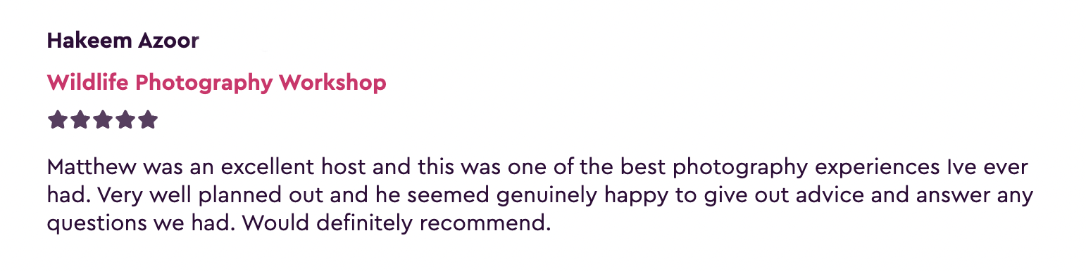 Here's some of the things people have to say about their experiences learning wildlife photography with me.