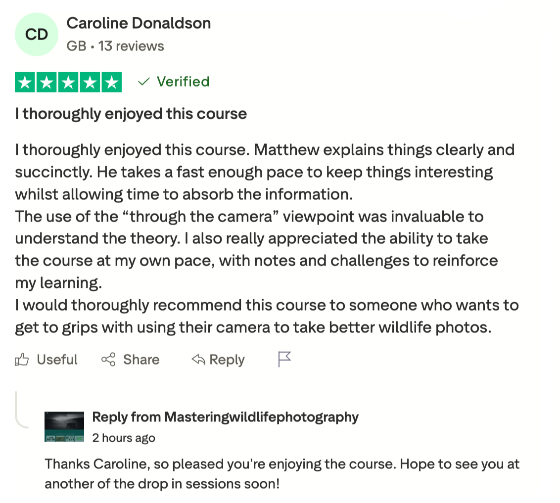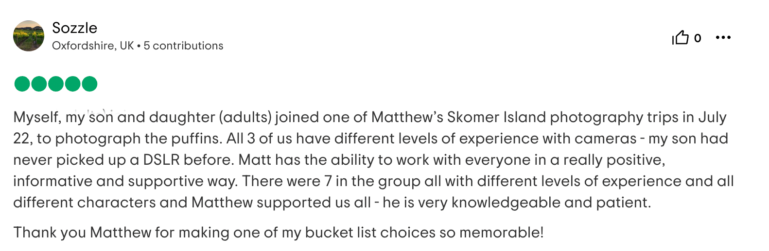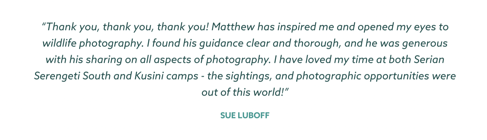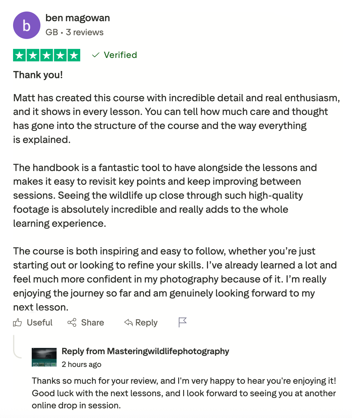 Here's some of the things people have to say about their experiences learning wildlife photography with me.