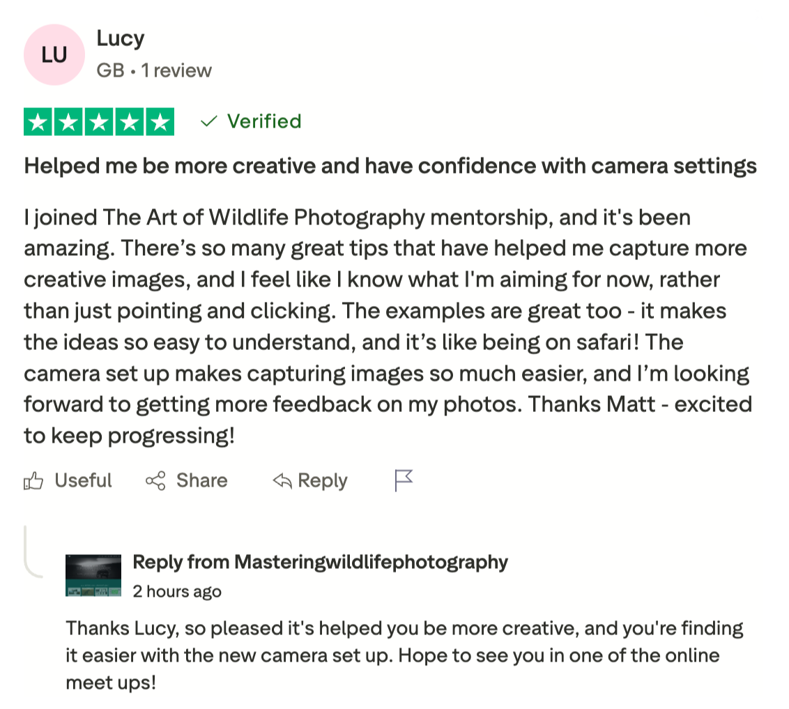 I am so excited to now be able to share everything I have learned over the last 20 years in one place online and would be honoured to be your mentor and guide on your journey to mastering wildlife photography.