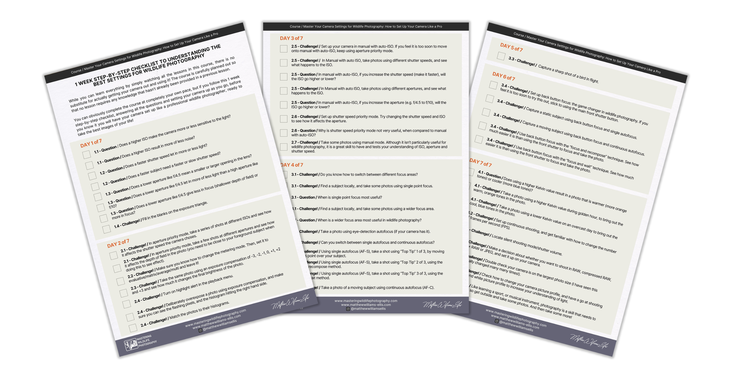 ✅ "1 week step-by-step checklist". Follow this, and 1 week from now you will understand the best camera set up for wildlife photography (you can do it quicker too!).