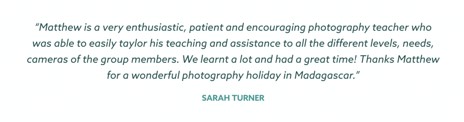 I have taught over 1,000 people in person, helping passionate wildlife photographers like you take the best images of their lives, while working as resident photographer at Alex Walker's Serian Camps in the Maasai Mara and while leading workshops and photography holidays to destinations including Tanzania, Antarctica, Costa Rica and Madagascar.