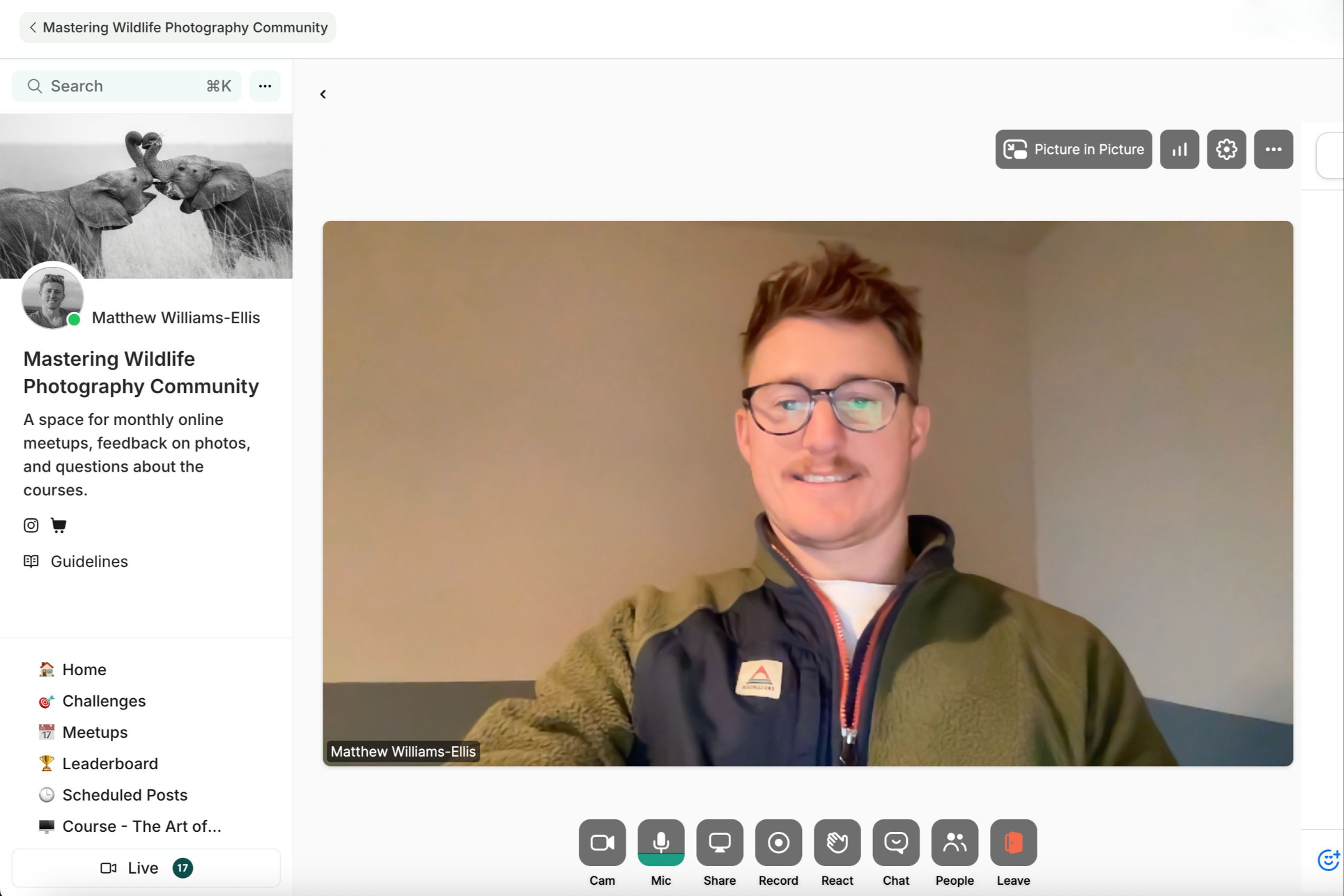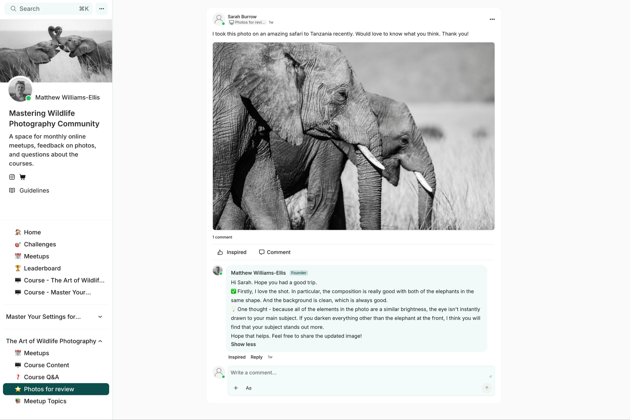 Through the "Mastering Wildlife Photography Community", join me for a monthly online meetup giving you the opportunity to ask any questions you might have.
